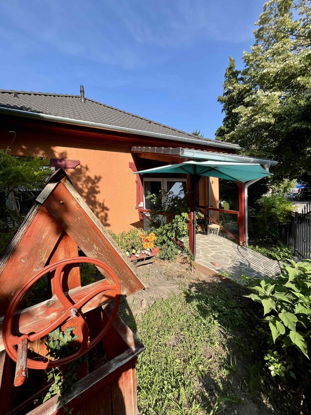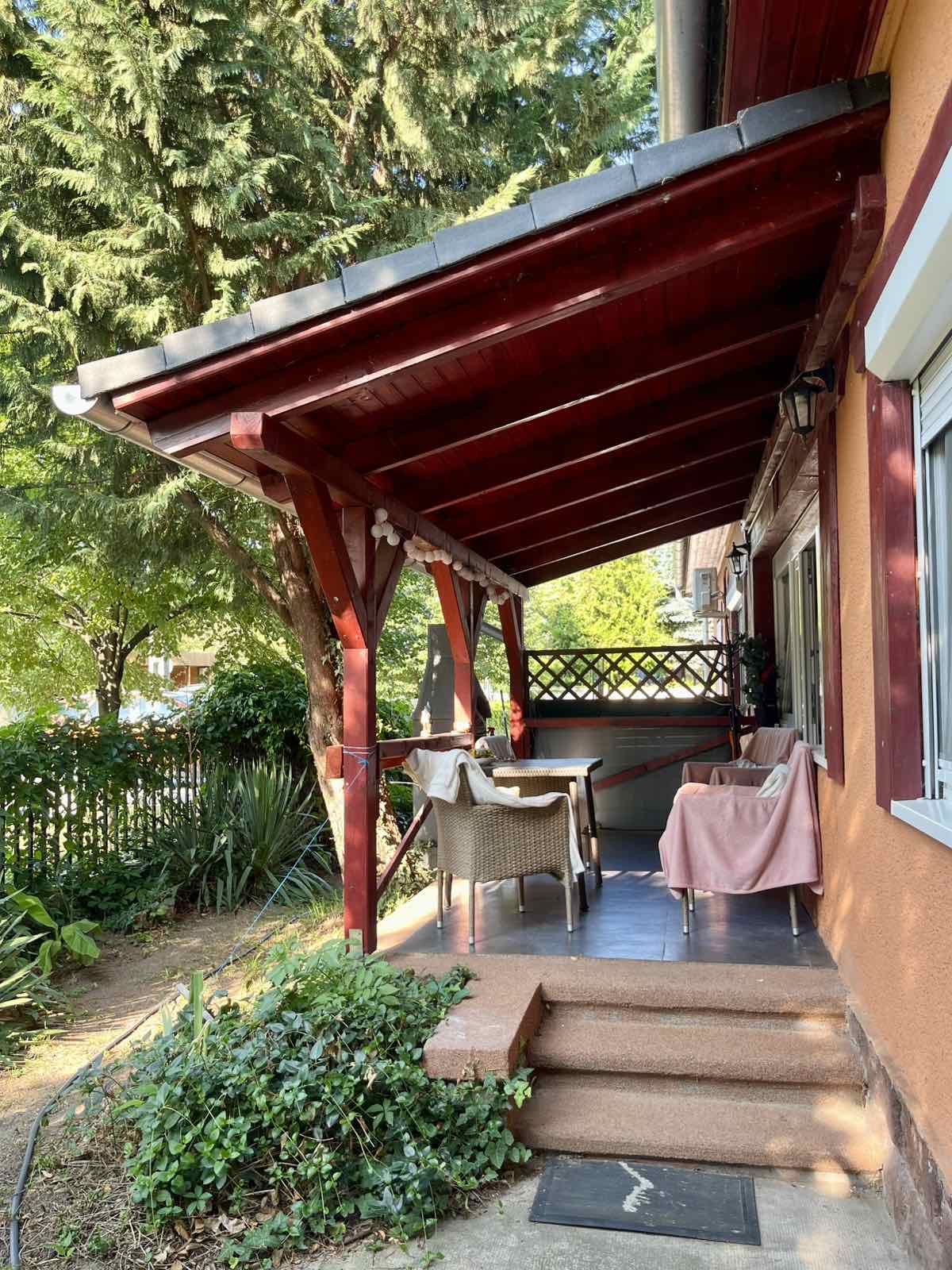 A háznak 3 bejárata van a kertben 4 autó számára beállási lehetőség, épített sütögető, díszkút valamint fúrt kút is helyett kapott.